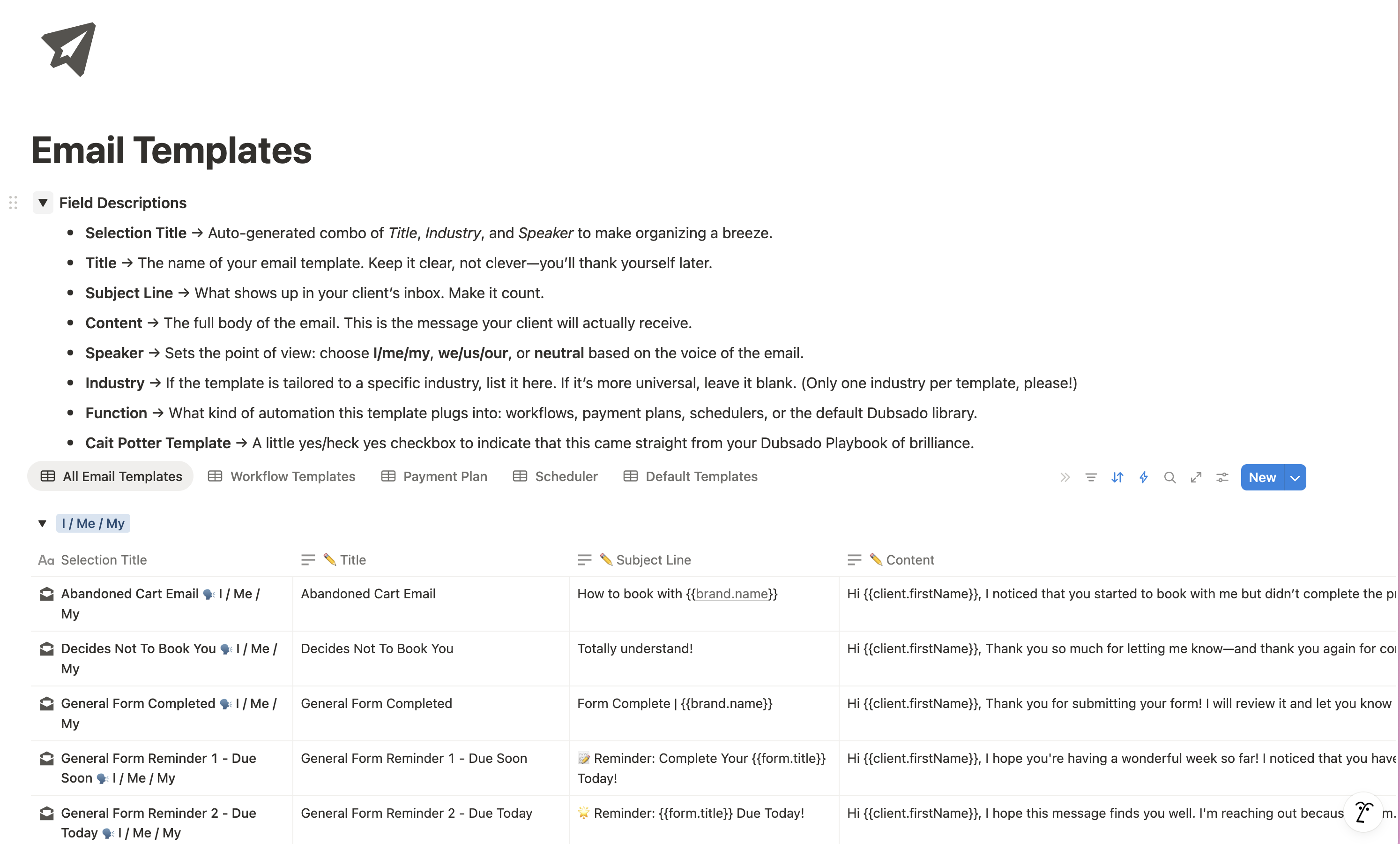 - A complete Smart Field Library at the bottom (so you’re not digging through Dubsado just to grab the client’s first name)