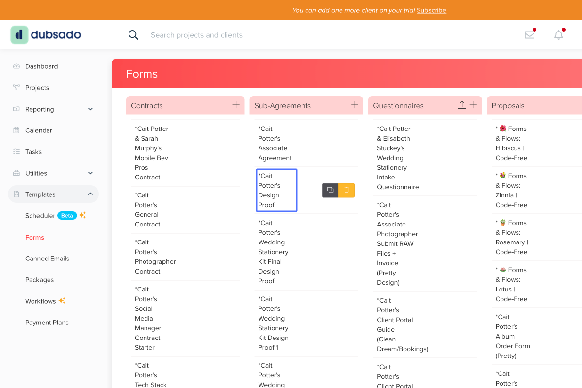 - Start at https://hello.dubsado.com/dashboard