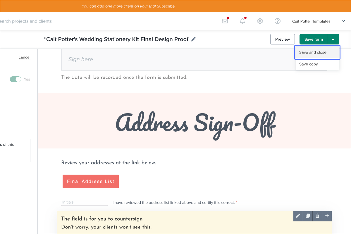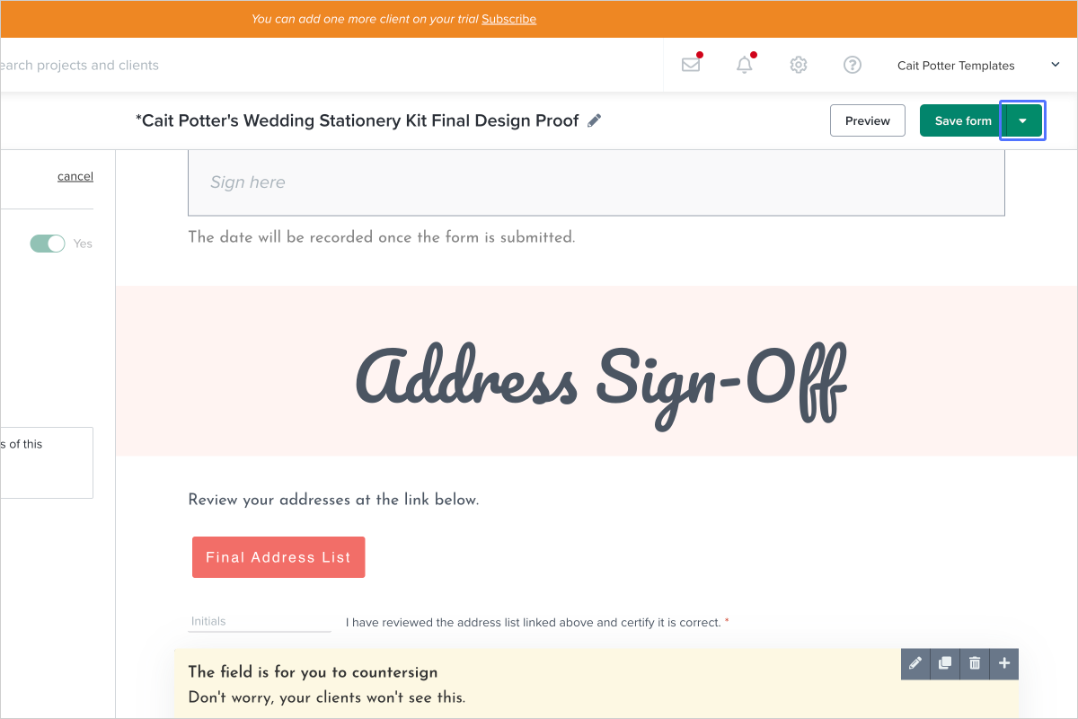 - In the menu on the left, you can determine if the signature field is for the client to sign or if it's for you as the business owner to sign.